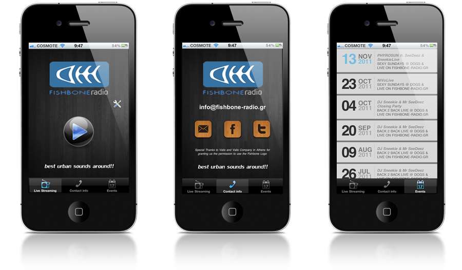 Our client was Fishbone Radio Thessaloniki, Best Urban Sounds Around powered by Dj Sneekie, which you can now access on the internet through this application. The navigation options for the user are 3. First of all, live streaming, so that you can listen to your favorite station live from your iphone. Secondly, the contact information option for any issue you might want to share with them and thirdly a list of all the upcoming as well as past events. Enjoy!